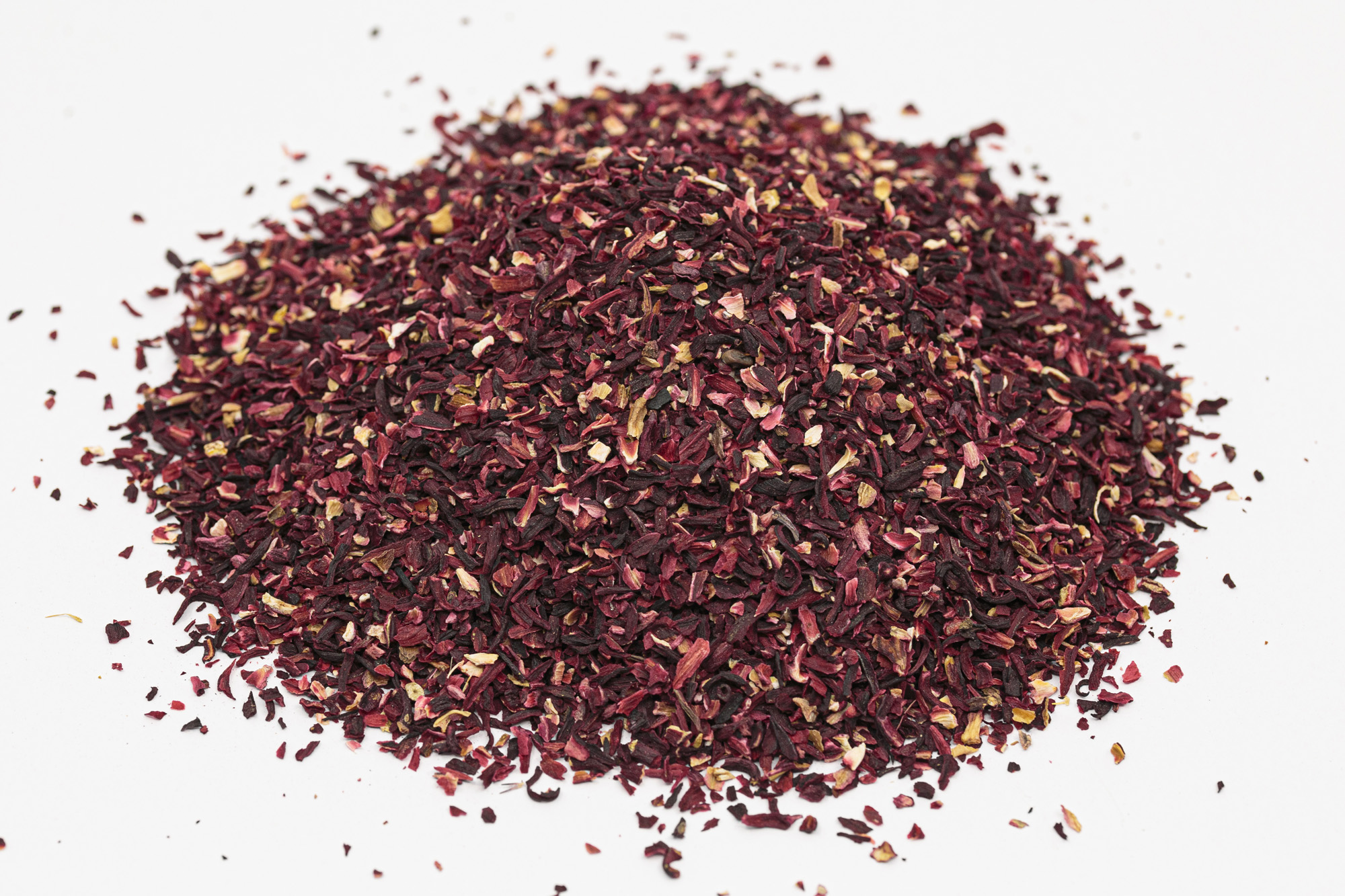 The dried hibiscus flower (lat. *Hibiscus sabdariffa*), also known as karkade, has characteristic dark red or ruby-red petals that are rich in phytochemicals. After drying, the flower retains its intense color and slightly sour taste. It is used in cooking, medicine, and cosmetics due to its numerous medicinal properties.